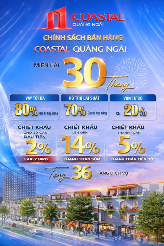 COASTAL QUẢNG NGÃI là dự án khu đô thị sinh thái biển quy mô lớn, hội tụ không gian sống gần gũi thiên nhiên và cảnh quan ven sông – ven biển tại tỉnh Quảng Ngãi. Dự án được quy hoạch bài bản theo xu hướng đô thị xanh, sinh thái và tích hợp các tiện ích hiện đại, góp phần nâng tầm chất lượng sống, thúc đẩy phát triển kinh tế – xã hội của khu vực.